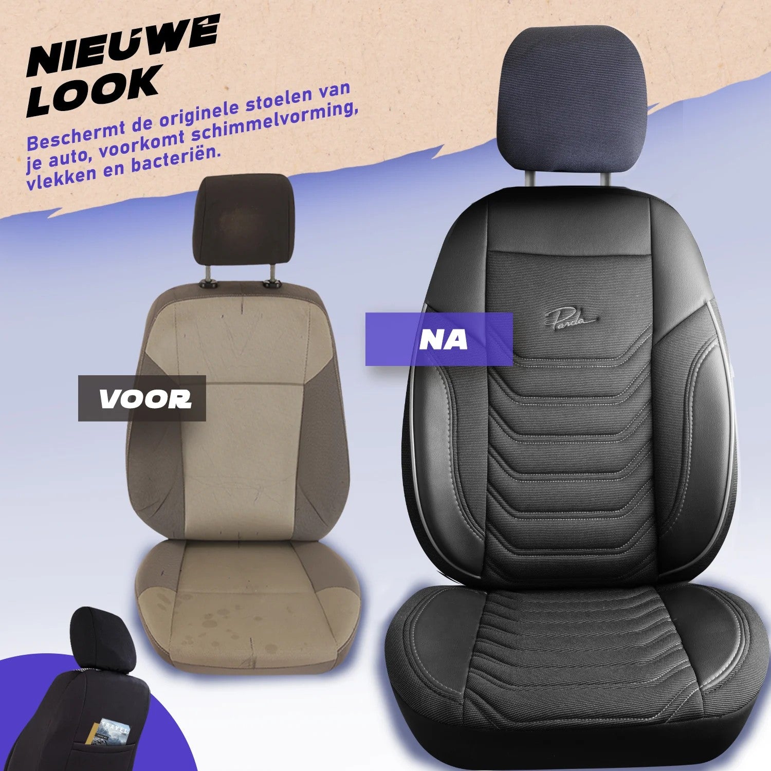 De bevestiging met elastieken en haakjes houdt de set stevig op zijn plaats, ook bij veelvuldig in en uitstappen. Reinigen kan eenvoudig met een vochtige doek en de hoezen zijn bovendien wasbaar in de wasmachine, ideaal voor intensief gebruik.